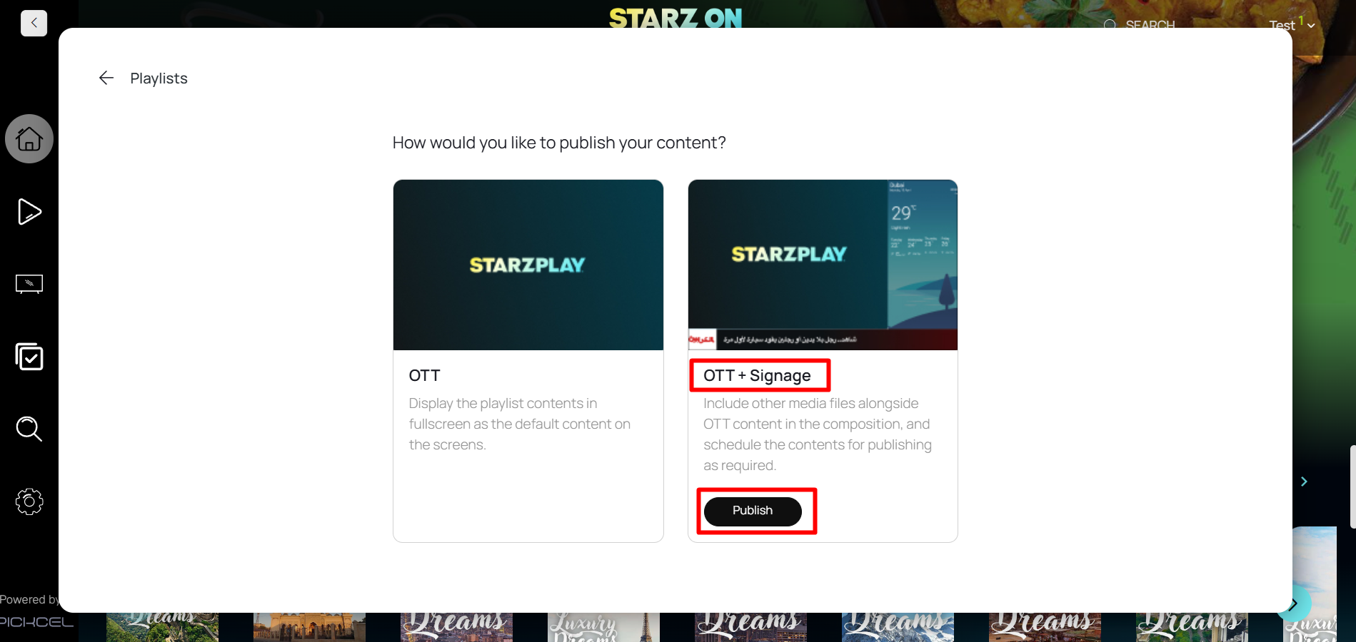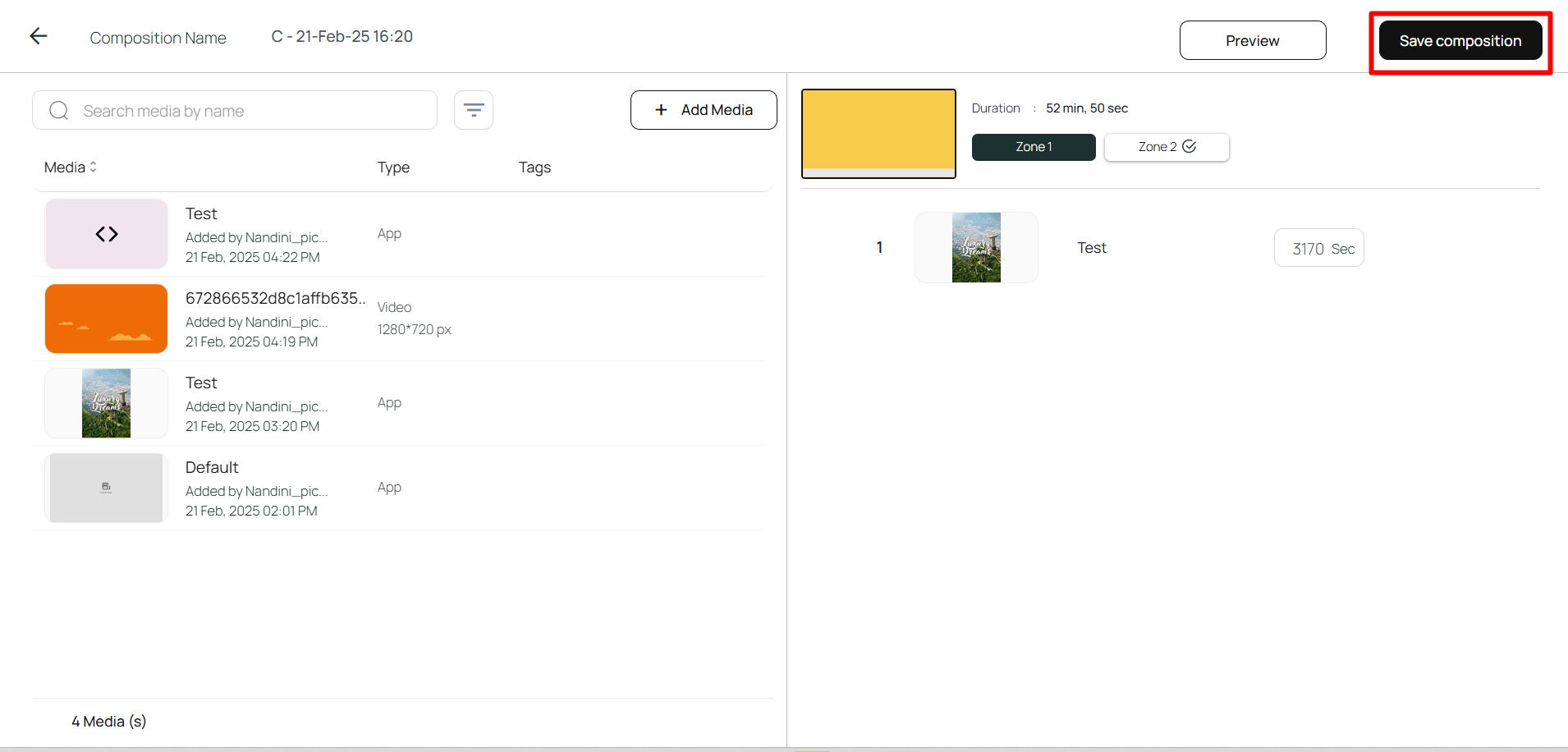 18. After selecting the layout, push the OTT content into one zone and the signage content into another zone then click on Save composition.