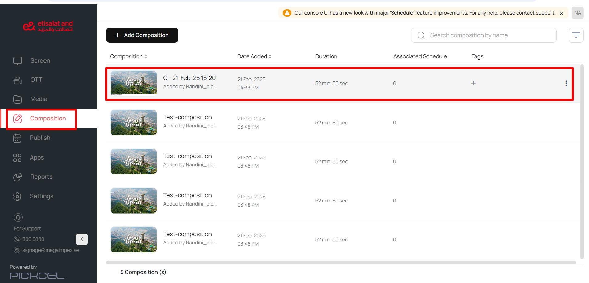 19. The composition has been created successfully. You can now create a schedule or assign it as Quickplay or set it as the default composition.