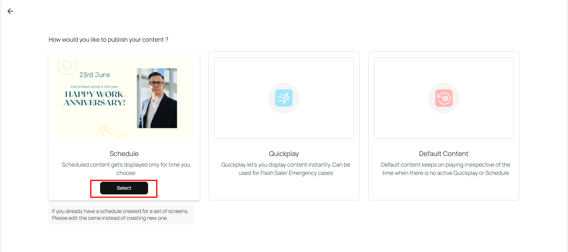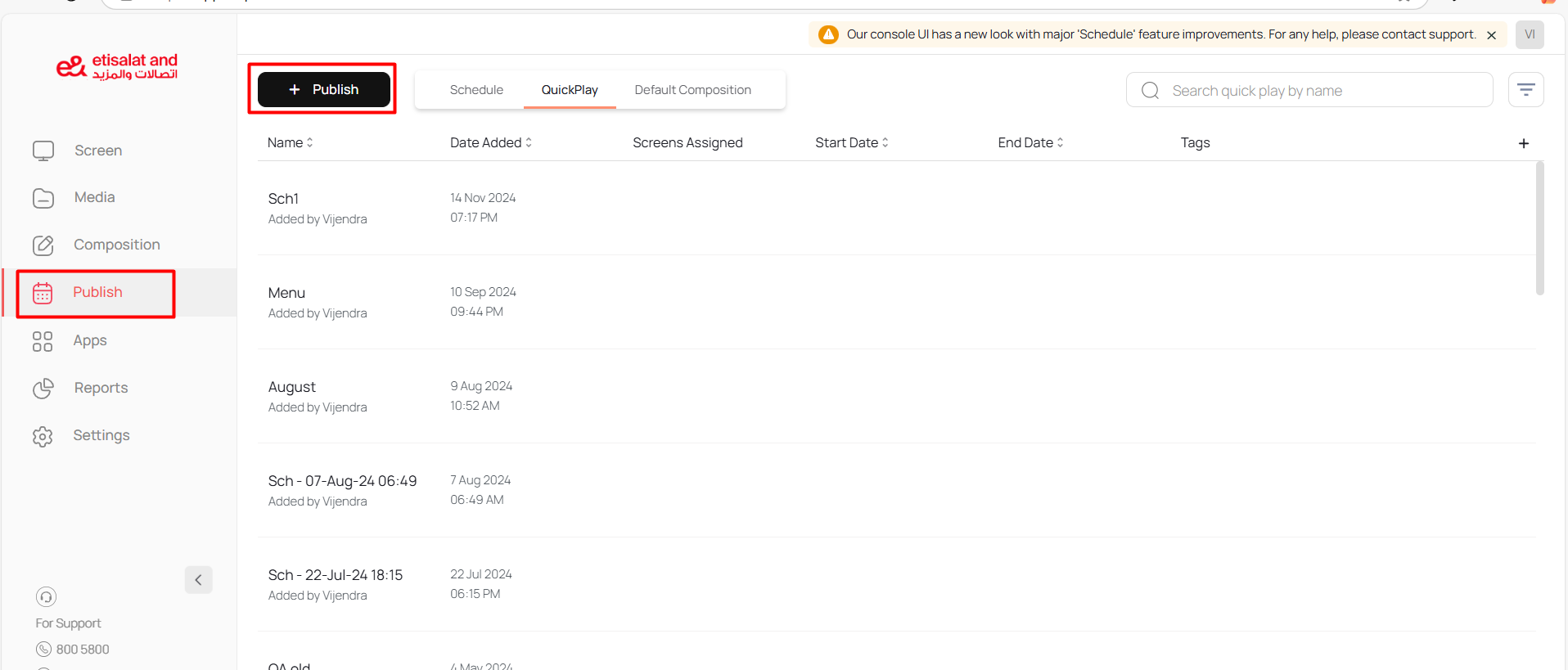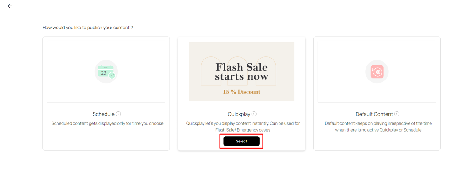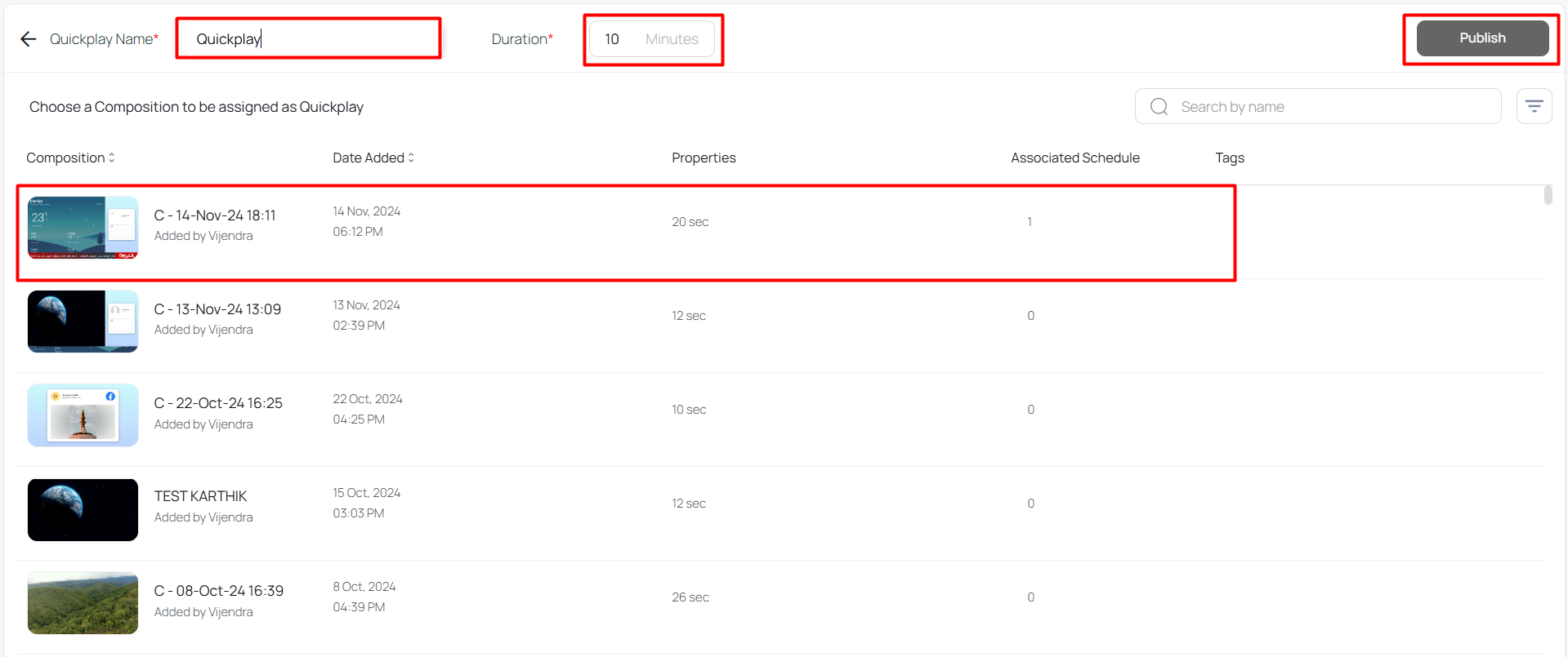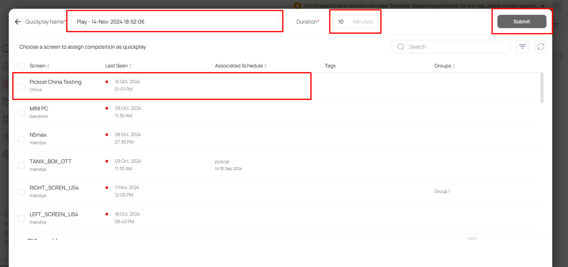 2. Give a name to this quick play and provide duration till when the content should run and also Select the screen's on which you would like to assign this quick play then Click on "Submit". Your contents are now live on the selected screens.
