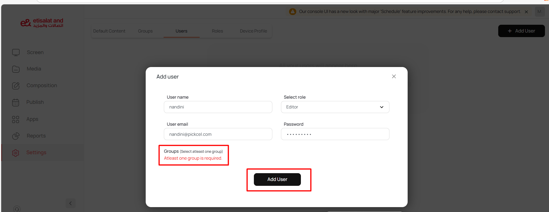 4. Select at least select one group (User creation is not possible without groups., then Click on Add User.