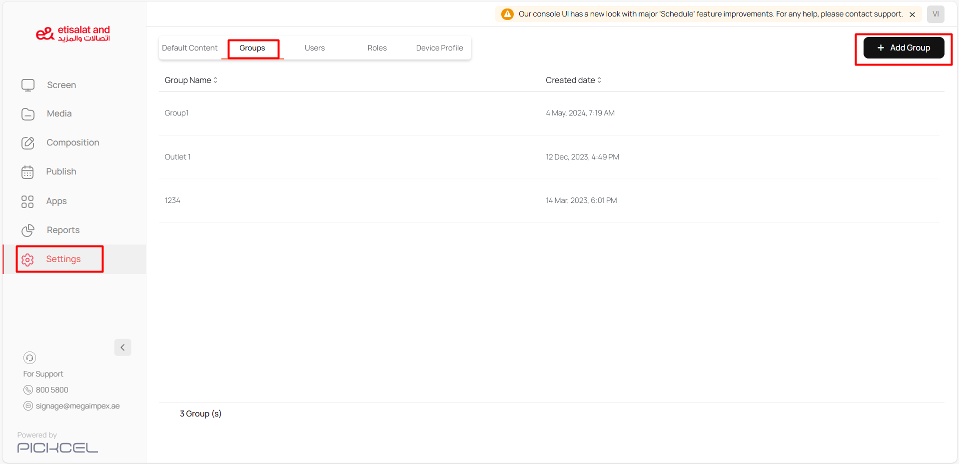 A 'Group' is a set of users who have access to a set of modules and its details within a Pickcel